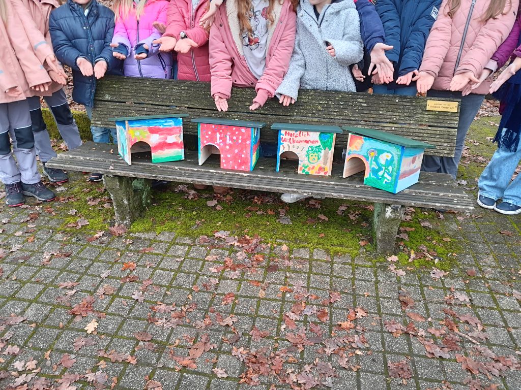 Wir sind die Kinder aus der Garten- und Natur AG und wir haben aus einzelnen Brettern Igelhäuser zusammengeschraubt. In der Mitte des Hauses ist ein Brett, damit die Feinde des Igels den Igel nicht holen können. Dann haben wir sie noch schön bemalt. Danach werden wir die Igelhäuser in die Natur bringen. Wenn die Igel das Haus angenommen haben, werden sie trocken und geschützt den Winter durchschlafen. Im Frühling können sie dort in Sicherheit ihre Jungen aufziehen.